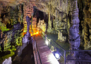 Die Dikteon-Höhle befindet sich oberhalb des Dorfes Psychro in der Lasithi-Hochebene auf einer Höhe von 1025 Metern. In Psychro gibt es einen großen Parkplatz mit vielen Restaurants. Von dort aus führen zwei Wege zur Höhle, und der Aufstieg dauert etwa 15 Minuten. Der einfachste Weg ist der linke, denn auf dem zweiten (und älteren) Weg sind die Steine von Tausenden von Touristen abgenutzt und rutschig. Der Weg zur Höhle ist wunderschön, da man einen herrlichen Blick auf die Ebene von Lasithi hat. Wenn man nicht zu Fuß gehen möchte, gibt es Esel, die die Besucher gegen eine Gebühr zur Höhle bringen. Neben dem Höhleneingang befindet sich ein Kiosk, an dem Besucher Eintrittskarten für die Höhle kaufen können. Die 2.200 Quadratmeter große Höhle ist gut beleuchtet, und die Wege in der Höhle sind auf einer Gesamtlänge von 250 Metern gut ausgebaut.