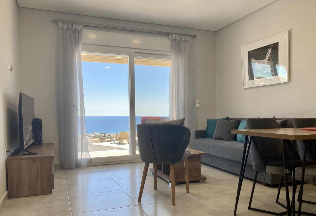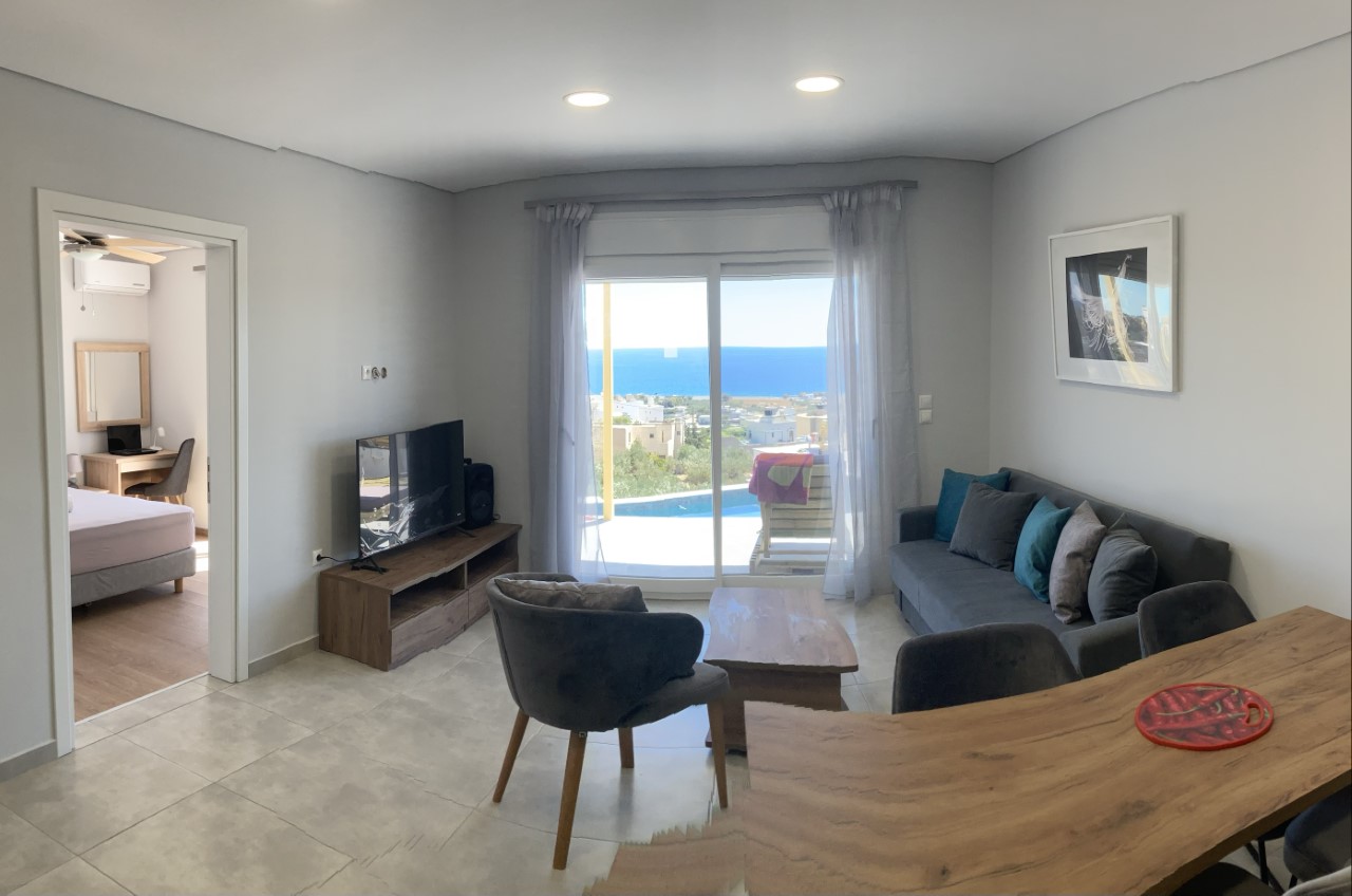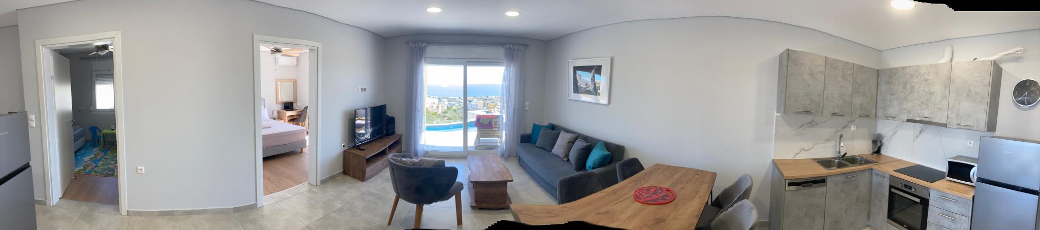 Villa indépendante avec vue sur la mer, avec deux chambres séparées, une cuisine, un coin salon et une terrasse confortable. Αdaptée aux familles et aux enfants en bas âge