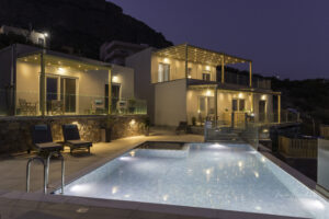 Notre complexe se compose de 4 villas indépendantes entièrement équipées. Elles disposent toutes de 2 chambres à coucher, d’une cuisine complète, de salles de bains spacieuses, d’une salle à manger et d’un salon confortables, d’un balcon ou d’une terrasse privés et d’une vue imprenable sur la mer Méditerranée.